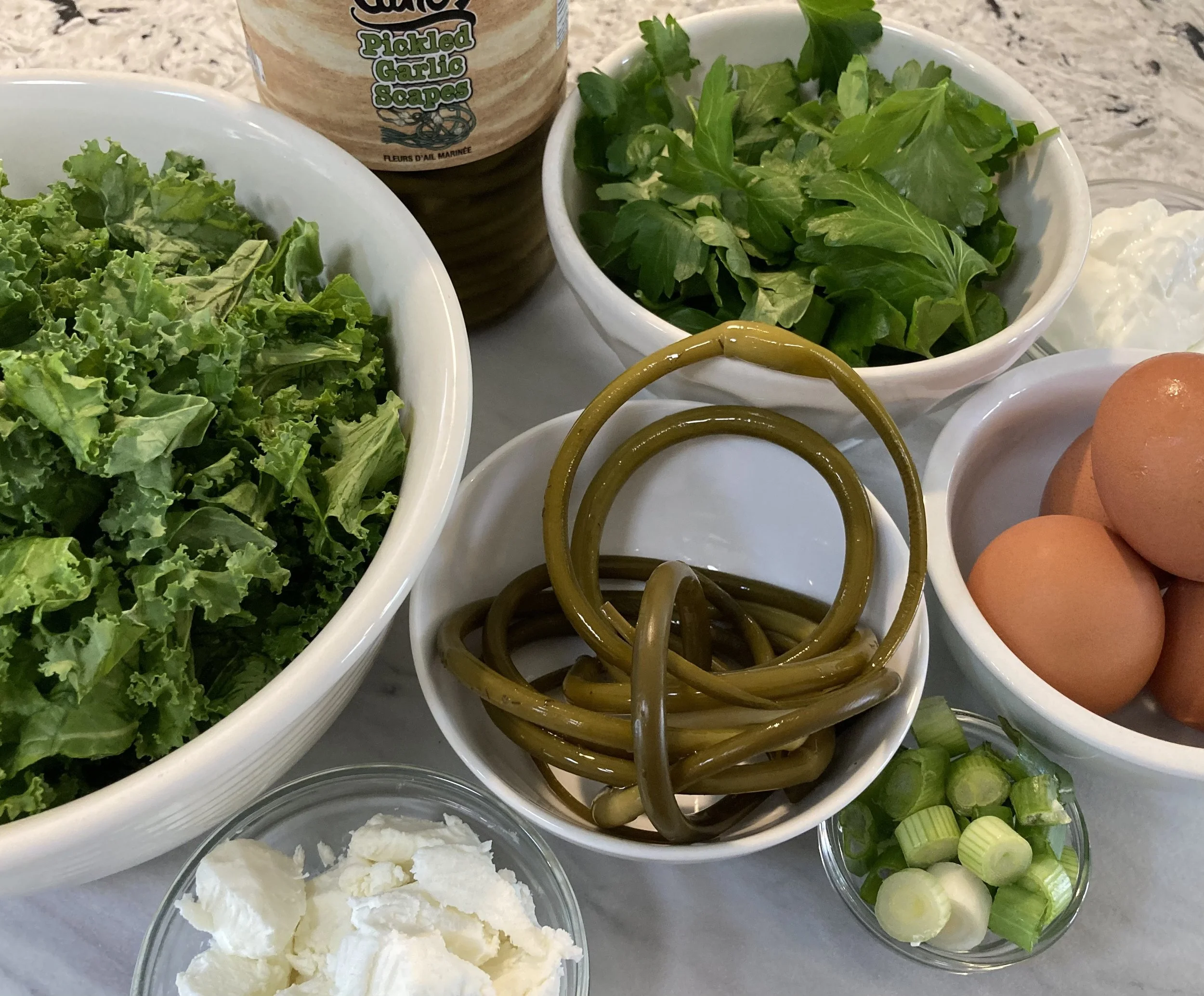 Whisk eggs, yogurt, half the cheese, chopped garlic scapes and parsley; season with salt & pepper and a pinch of red pepper flakes, if desired; set aside.