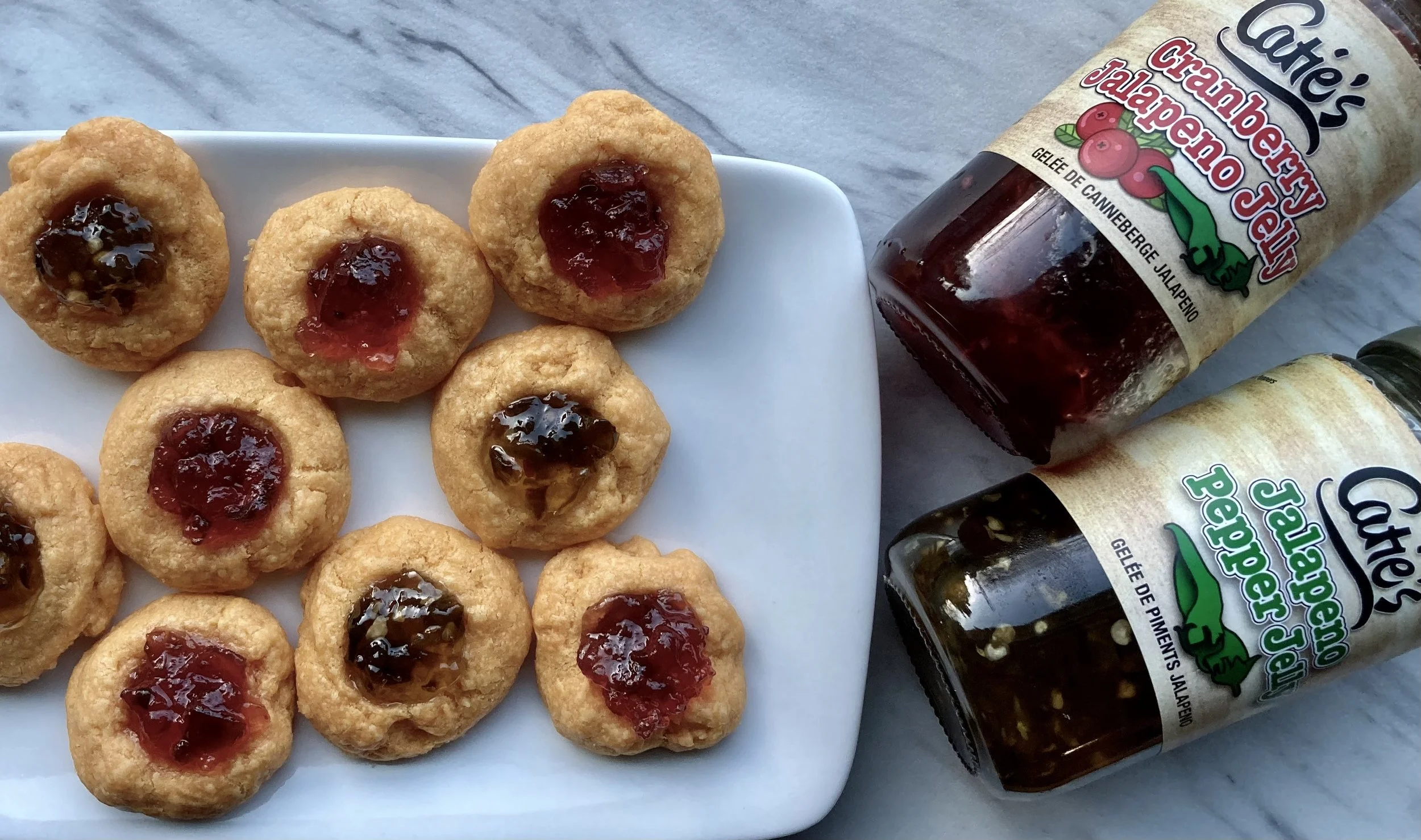 Cool on a rack and fill with a dollop of pepper jelly just before serving - we like using Cranberry Jalapeno Jelly & Jalapeno Pepper Jelly for a festive red & green touch!