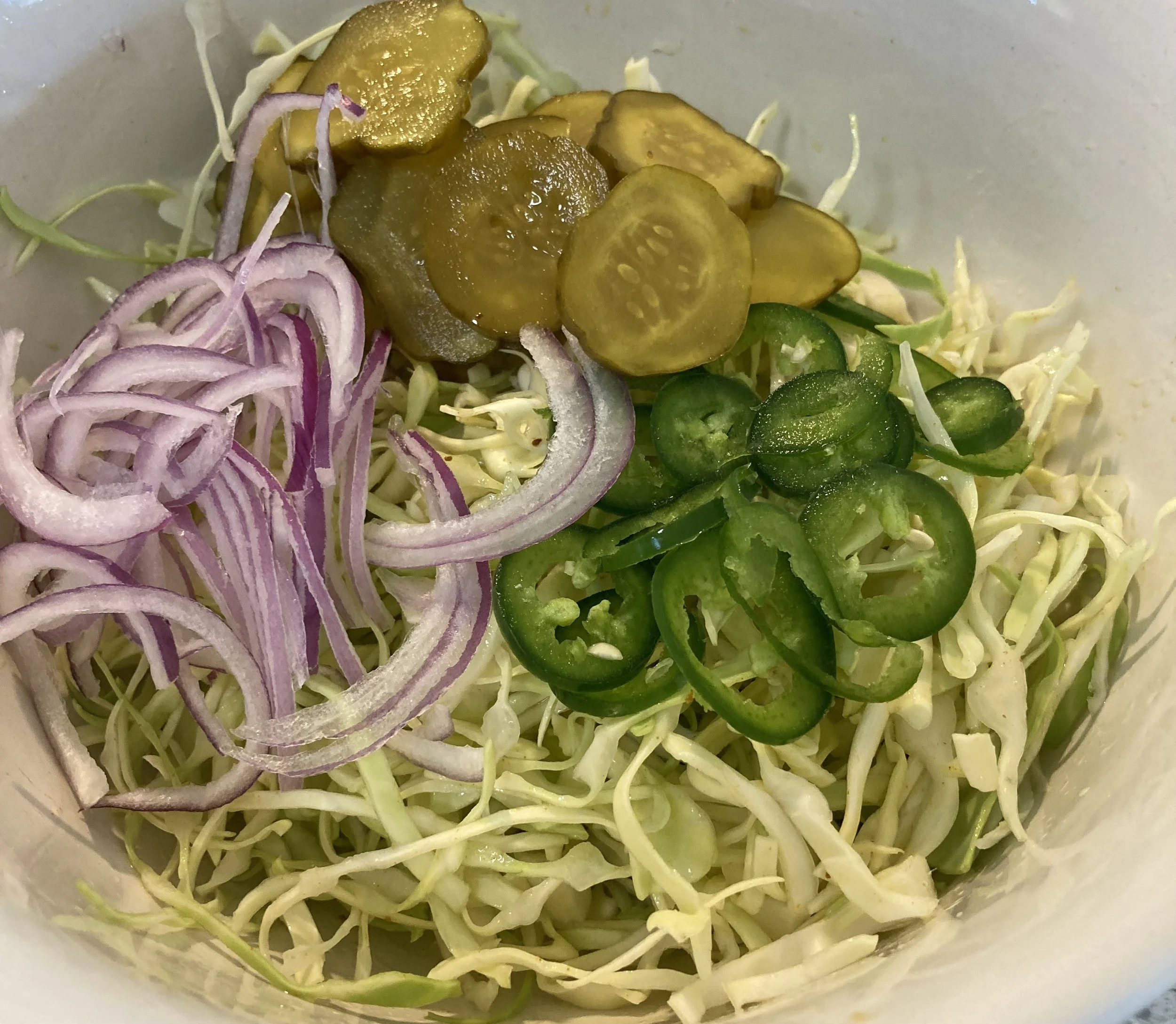 1/2 small red onion, thinly sliced (We also like to sliver a few of the sweet white onions from our pickles and add them to the mix!)