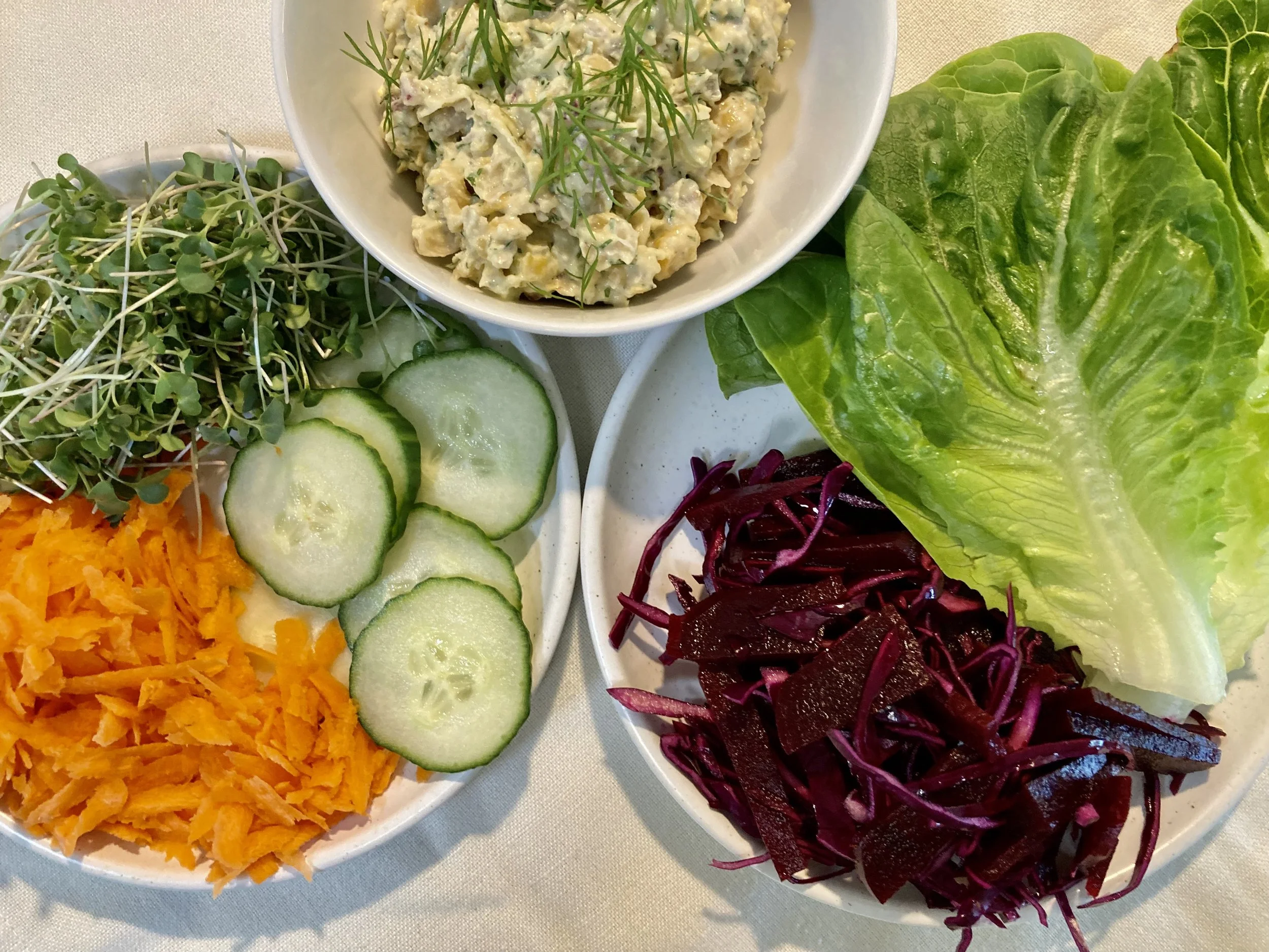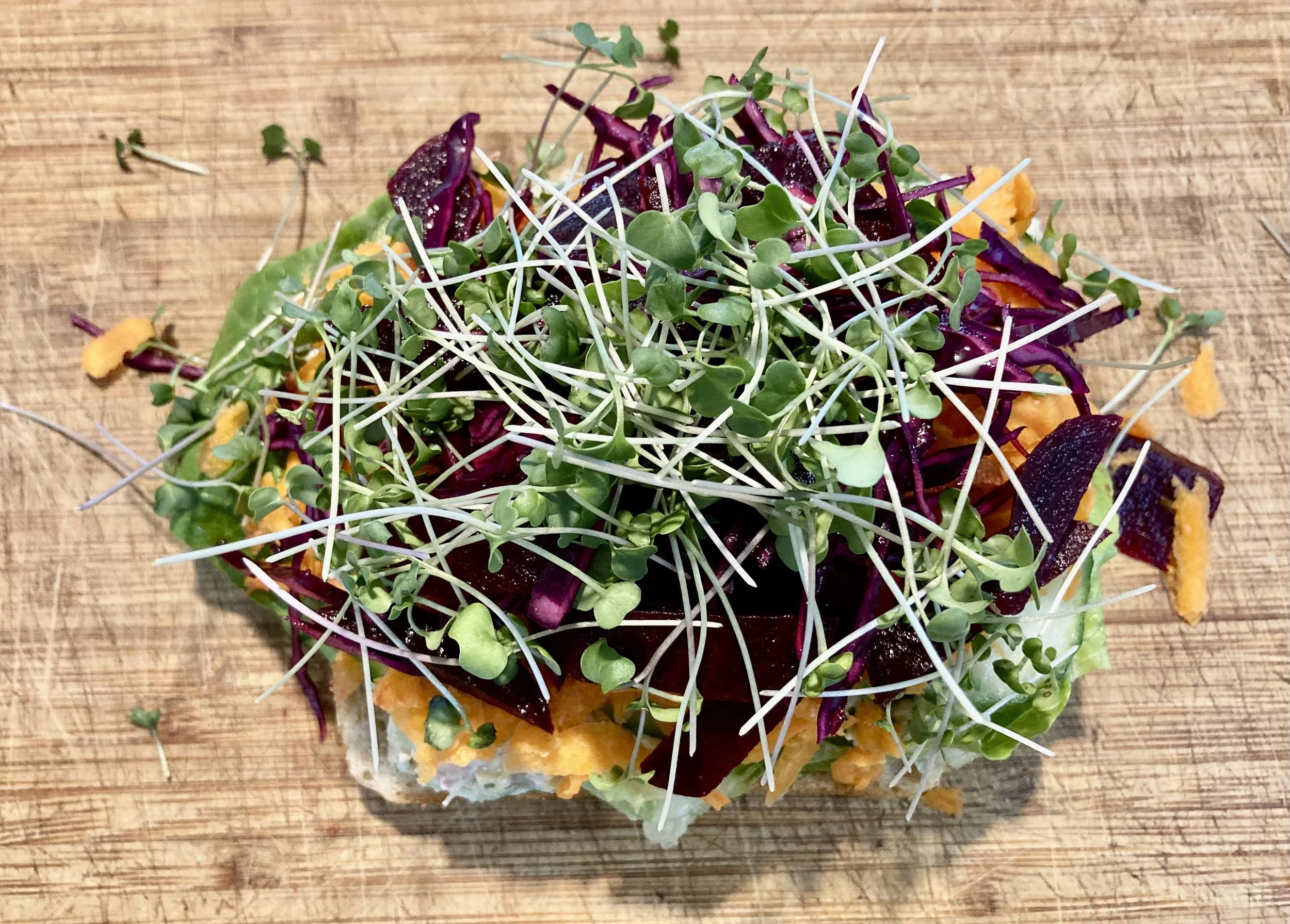 Layer one slice of bread with lettuce, chickpea salad, cucumber slices, grated carrots, pickled beet & cabbage mixture, and microgreens.