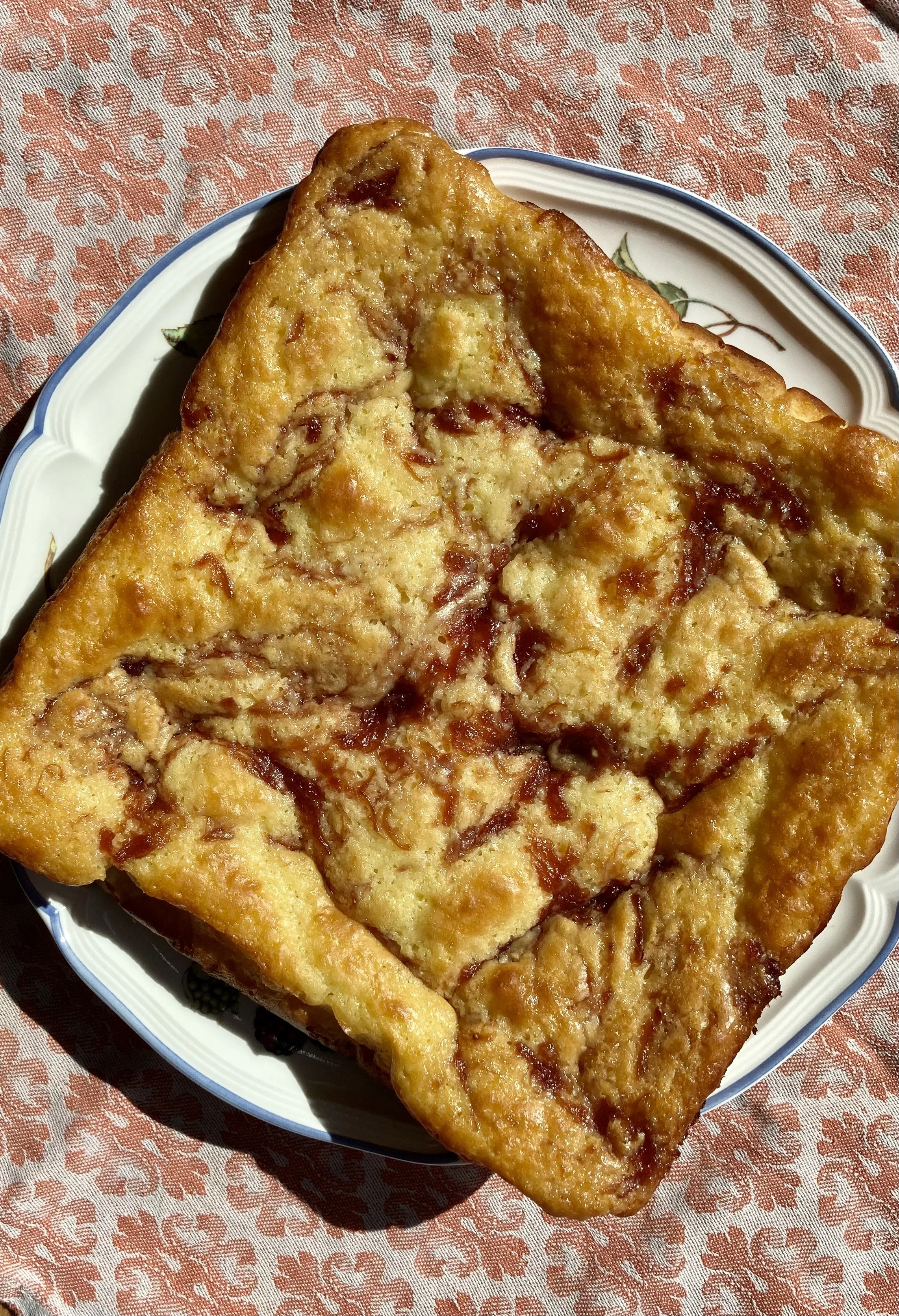 Bake the cake until golden brown, firm to the touch, and a toothpick inserted in the centre comes out clean (be mindful that it might pick up some jam), about 45 minutes. Let the cake cool in the pan on a wire rack to room temperature.